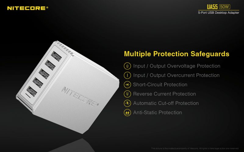 The Nitecore UA55 5-Port USB Adapter provides 5 USB outputs, with each port capable of delivering up to 2A of charging current.